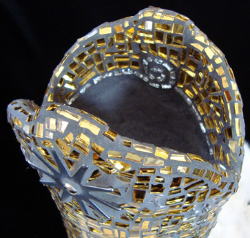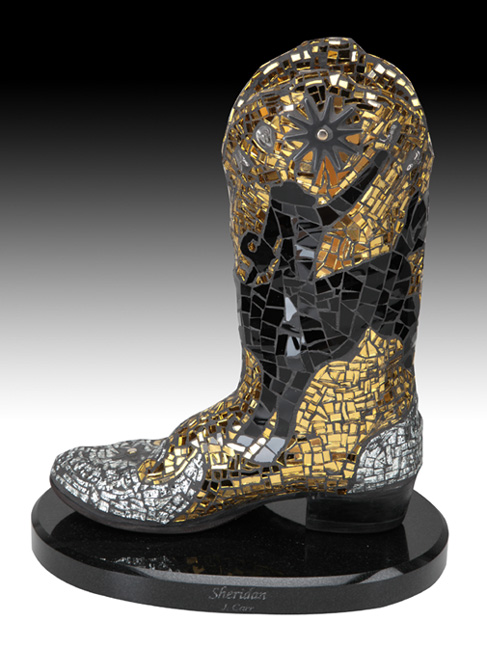 | Inspired by the state and town in which the artist grew up, this proud cowboy hangs on to the buckin' bronc. Using silver adornments (stars, hat, butterfly), the Wyoming state motif shines with silver and gold mirrored glass. | |||||||||||||