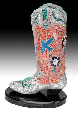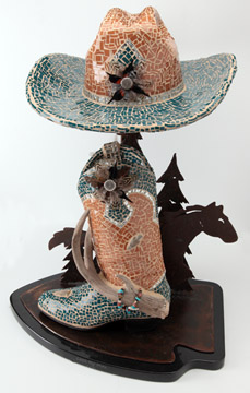 Each unique mosaic sculpture starts with a previously owned boot, hat or saddle. They take their form from a variety of materials that include stained glass, mirror, glass beads, sterling silver, turquoise, other semi-precious gemstones, and "used treasures.” The resulting piece of fine art might be a cowgirl boot of iridescent stained glass adorned with amethyst and jade, or an old tooled saddle with a yellow rose of Texas design on the seat and stirrups of mirrored glass. |